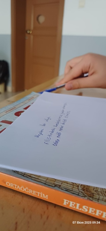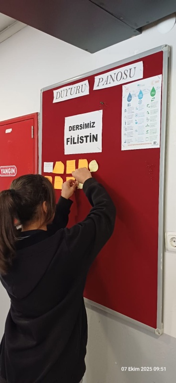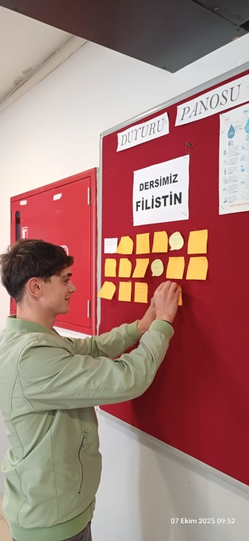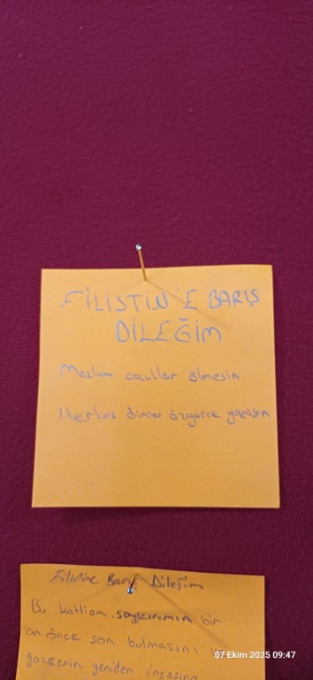 9. sınıf öğrencileri, etkinliğe bir dakikalık saygı duruşu ve dua ile başladı. 10. sınıflar, “Filistin’e Barışa Dair Mektup” etkinliğiyle ortak bir mektup kaleme aldı. 11. sınıf öğrencileri, “Filistin’e Barış Dileğim” başlıklı mesajlarını küçük kâğıtlara yazarak okul panosuna astı. 12. sınıflar ise “Dünyada adaletin ve barışın sağlanması için ben ne yapabilirim?” konulu kompozisyonlarını yazarak düşüncelerini paylaştı.